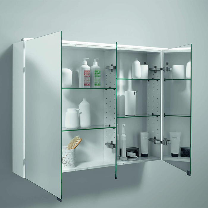 —BURGBAD Eqio Зеркальный шкаф с LED подсветкой 5Вт IP24, 120х80х17см, 3 зерк. двери с обоих сторон, версия левая L, стекл полки, вкл/выкл, цвет: белый F2009