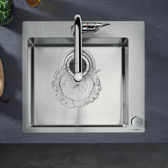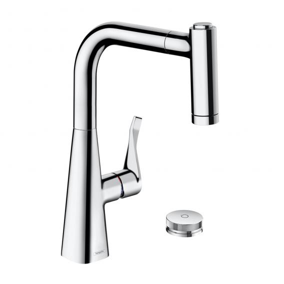—Hansgrohe Metris Select M71 Смеситель для кухни, на 2 отв, поворотный излив: 21.1см с вытяжным душем, 2jet, h:22см, sBox, кнопка вкл/выкл, цвет: хром