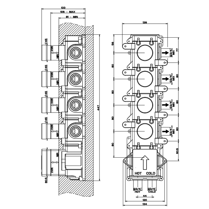 —Gessi Внутренняя часть встраиваемого термостатического смесителя с 4мя независимыми выходами