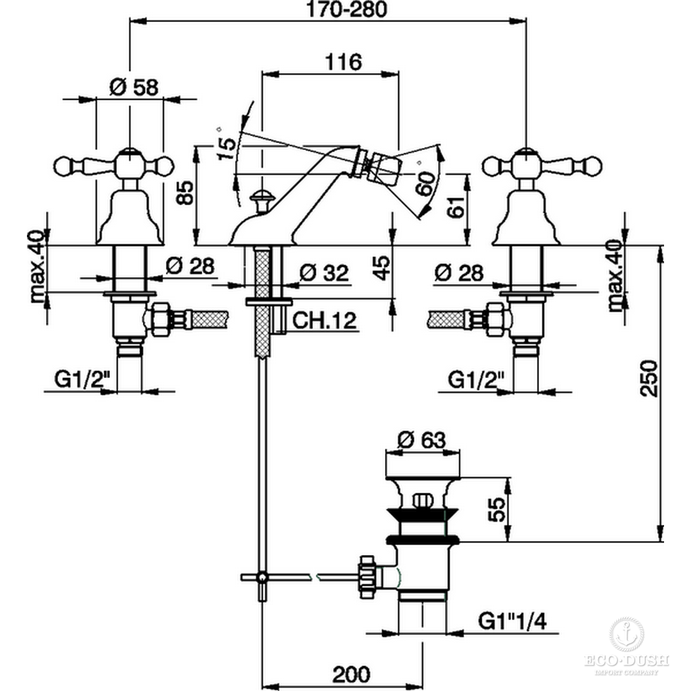 CISAL Arcana America Смеситель для биде на 3 отверстия, с донным клапаном, цвет хром
