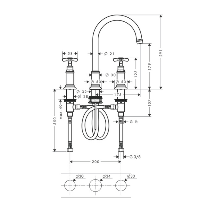 AX Montreux Смеситель для раковины 180 на 3 отв., излив 175мм, с донным клапаном, цвет: шлифованный никель