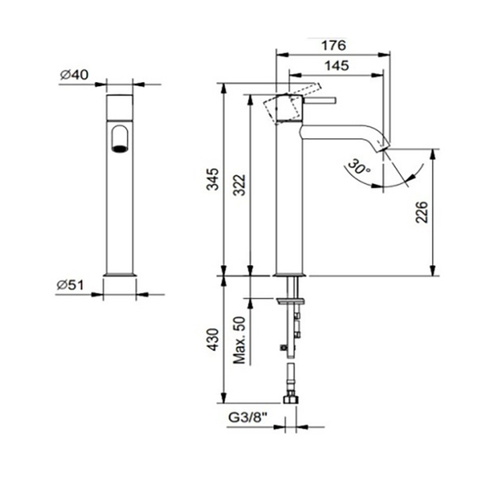 —Fantini Nostromo Смеситель для раковины, 1 отв., без донного клапана, излив 145мм, цвет: черный матовый