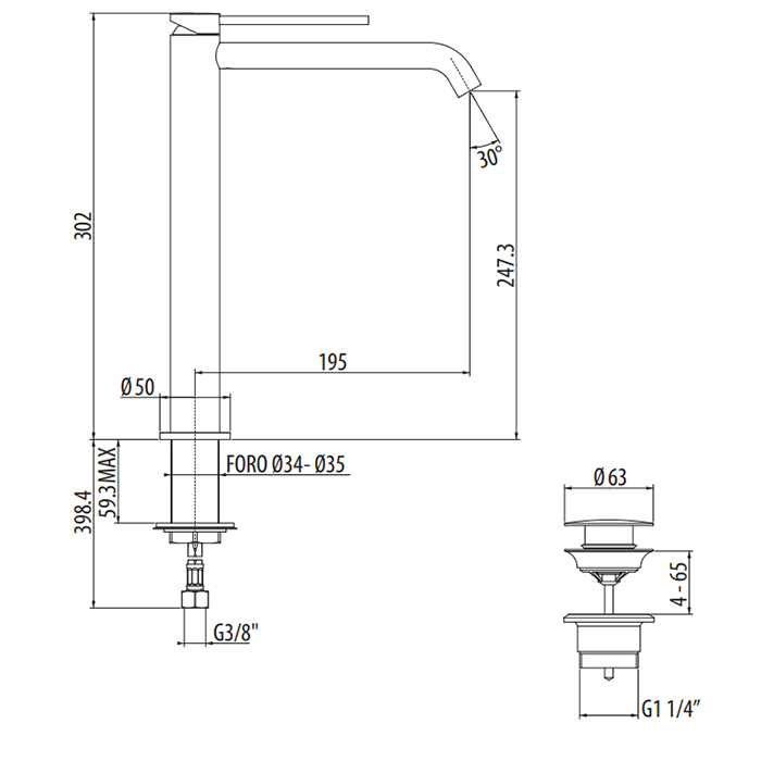 —Gattoni Circle Two Смеситель для раковины высокий 302 мм, на 1 отверстие, излив 195 мм, с донным клапаном, цвет: хром