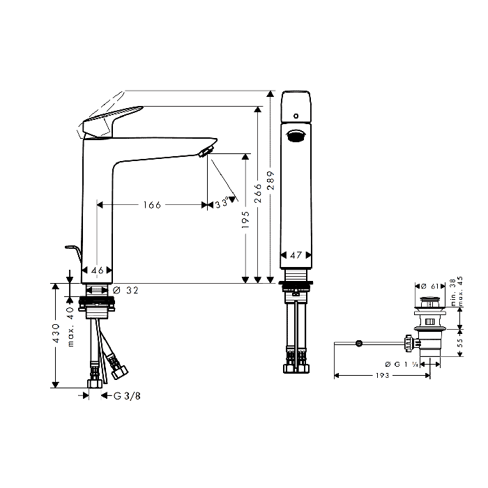 HG Logis Смеситель для раковины 190 на 1 отв. с донным клапаном, излив 166мм, h195мм, цвет: хром