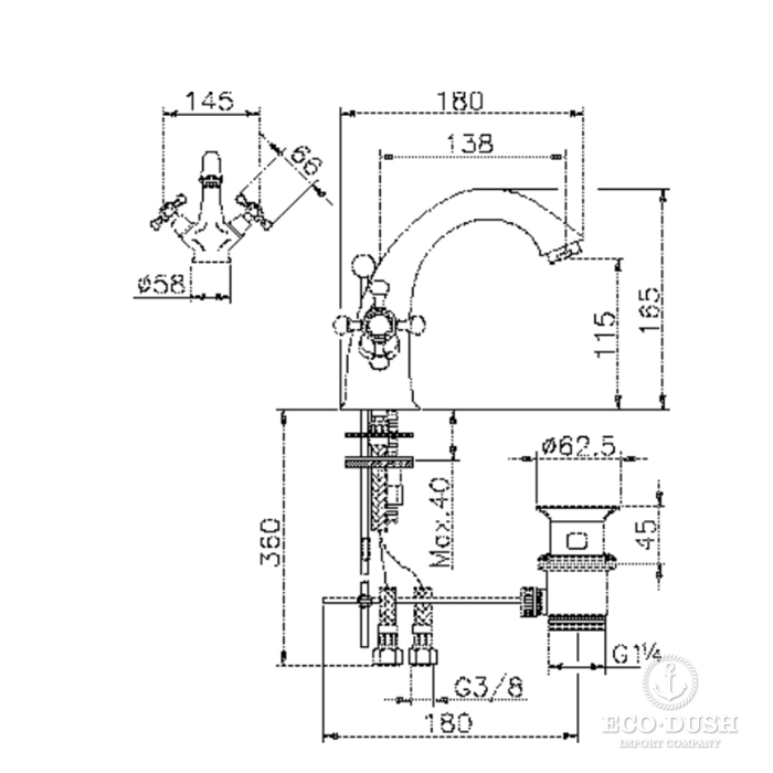 HUBER Victorian Смеситель двухвентильный для раковины на 1 отверстие с донным клапаном, цвет бронза