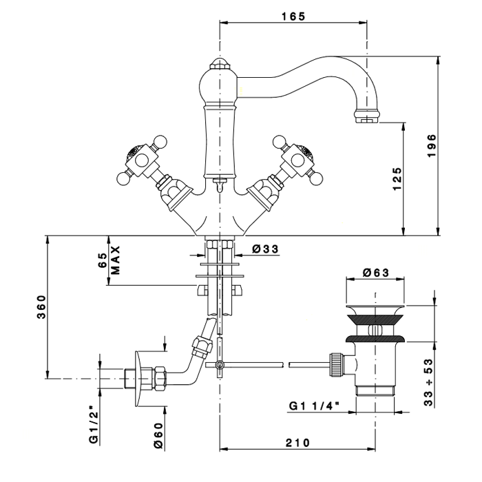 Nicolazzi P.M.Blanc Смеситель для раковины с 2мя ручками, на 1 отв., с донным клапаном, излив 165мм, цвет: хром