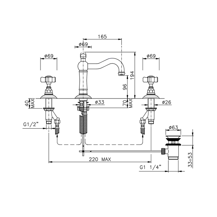 Nicolazzi Dames Anglaises Смеситель для раковины на 3 отверстия, с донным клапаном, излив: 165мм, цвет: хром