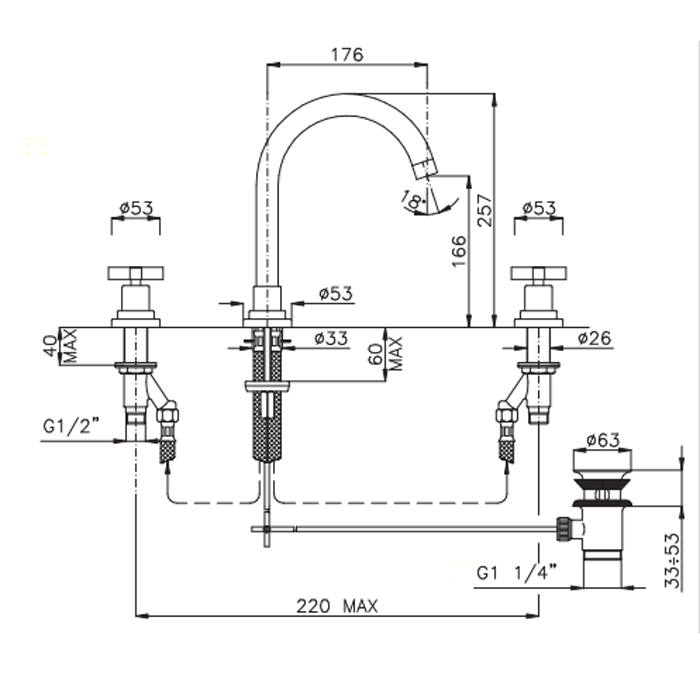 Nicolazzi M.Croce Смеситель для раковины на 3 отверстия, с донным клапаном, излив: 176мм, цвет: хром
