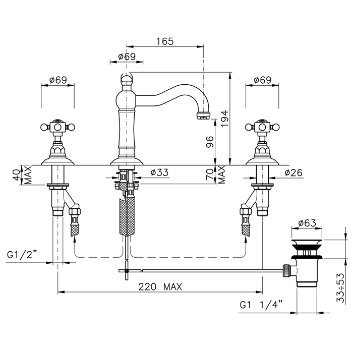 Nicolazzi Cristallo Liberty Смеситель для раковины на 3 отверстия, с донным клапаном, излив: 165 мм, цвет: хром