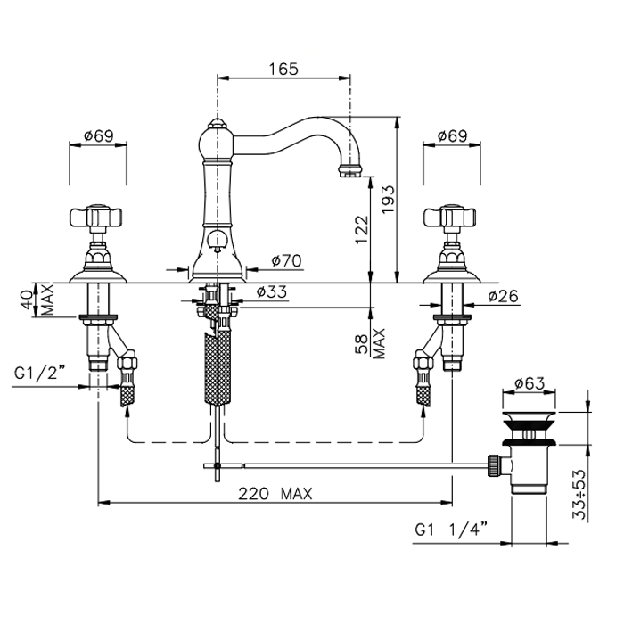 Nicolazzi Dames Anglaises Смеситель для раковины на 3 отверстия, с донным клапаном, поворотный излив: 165мм, цвет: хром