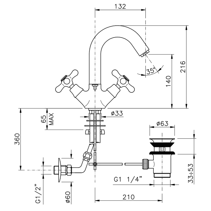 Nicolazzi Nuova Brenta Смеситель для раковины с 2мя ручками, поворотный излив: 132мм, с донным клапаном, цвет: хром