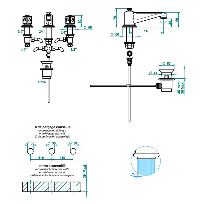 THG CAPUCINE VERT DECOR PLATINE Смеситель для раковины на 3 отверстия, с донным клапаном, декор платина/зеленый, цвет хром