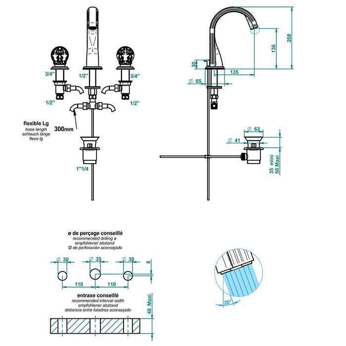 THG FLORE Смеситель для раковины на 3 отверстия, с донным клапаном, цвет хром