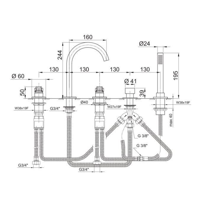 —Fantini AL/23 Смеситель для ванны, набортный, 5 отв., излив: 160 мм, цвет: хром