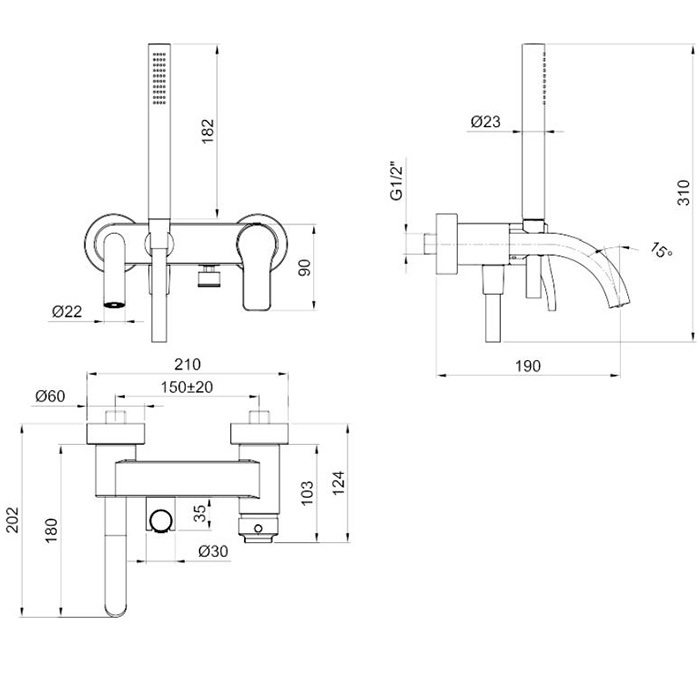 —Fantini AL/23 Смеситель для ванны, настенный, излив: 190 мм, цвет: хром
