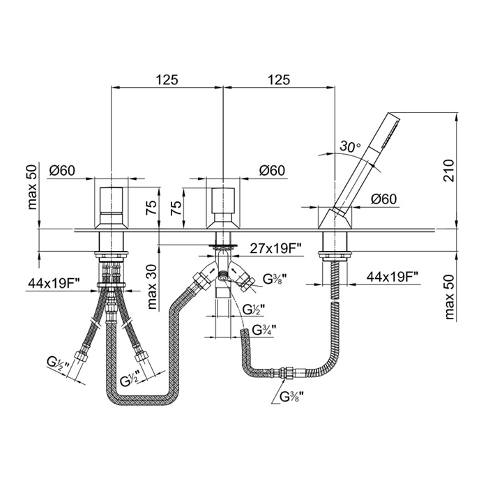 Fantini Nostromo Смеситель на борт ванны, на 2 источника, 3 отв., с ручн душем, без излива, цвет: хром