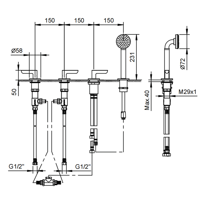 Fantini Icona Deco Смеситель на борт ванны, 4 отв., без излива, с ручн.душем, цвет: хром