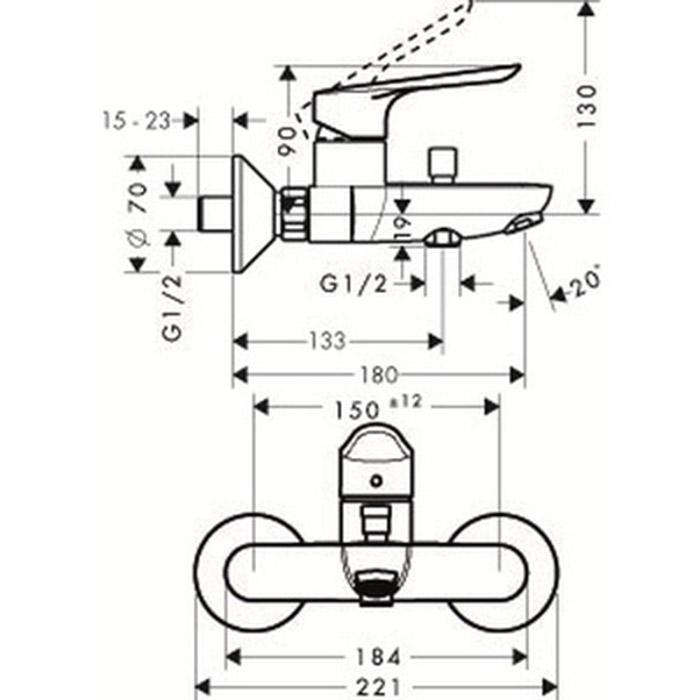 HG Logis E Смеситель для ванны, настенный, излив 180мм, с переключателем на душ, цвет: хром