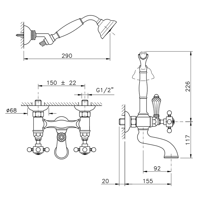 Nicolazzi Petit Mont Blanc Смеситель для ванны с душем duplex настенный на 2 отверстия, излив: 155 мм, цвет: хром