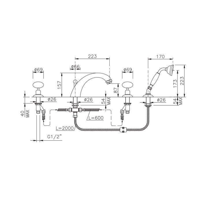 —Nicolazzi Cristallo Di Rocca Смеситель на борт ванны, 4 отв., излив: 223 мм, с ручным душем, цвет: хром