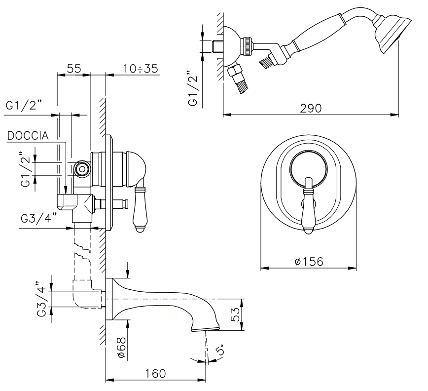 —Nicolazzi El Capitan Смеситель для ванны однорычажный, встраиваемый, с изливом 160мм и ручным душем, цвет: тёмная бронза