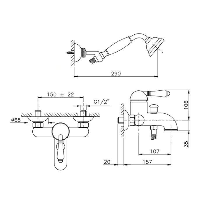 Nicolazzi El Capitan Смеситель для ванны однорычажный, настенный, с ручным душем, цвет: тёмная бронза