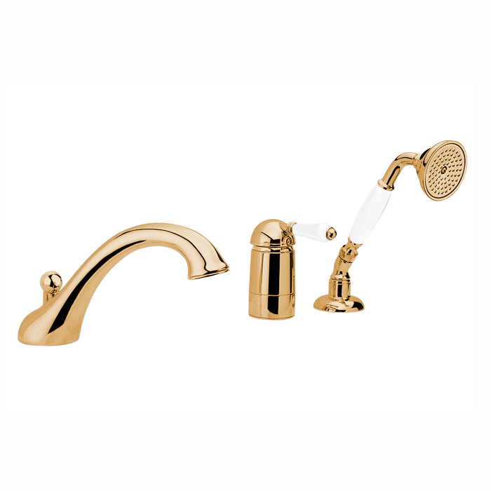 Nicolazzi P.m. Blanc Смеситель на борт ванны на 3 отверстия, с изливом 200мм и ручным душем, ручки белая керамика, цвет: золото 24к