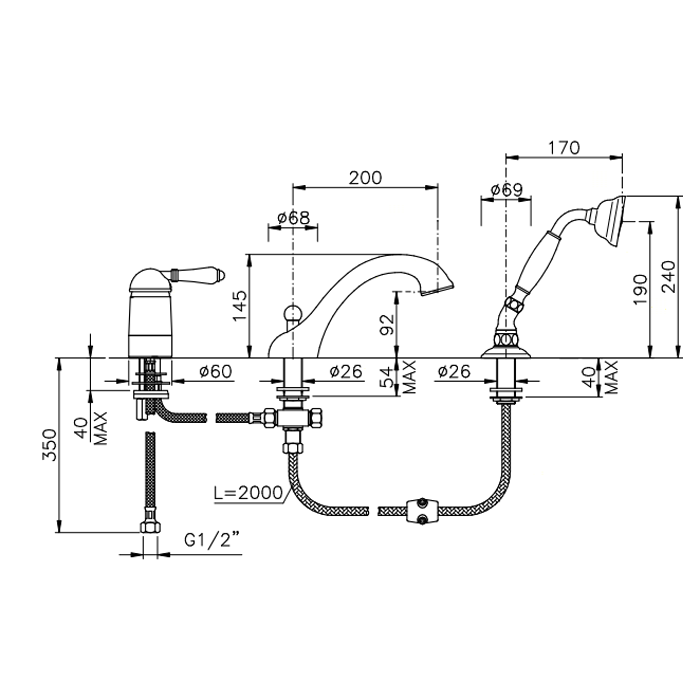 —Nicolazzi P.m. Blanc Смеситель на борт ванны на 3 отверстия, с изливом 200мм и ручным душем, ручки белая керамика, цвет: золото 24к