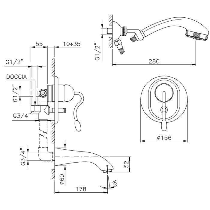 Nicolazzi Signal Смеситель для ванны встраиваемый на 3 отверствия, излив: 178 мм, цвет: хром