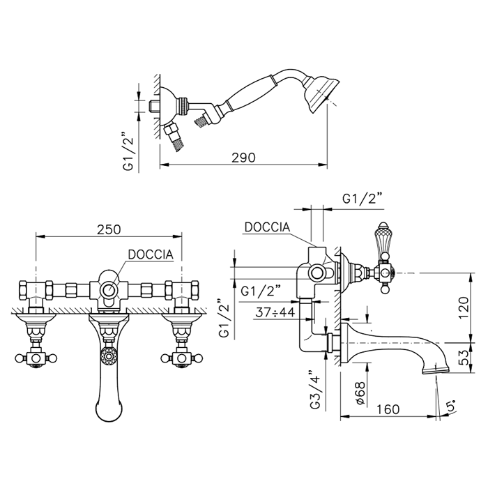 —Nicolazzi Half Dome Crystal Смеситель для ванны с изливом от стены на 4 отверствия, встраиваемый, излив: 160 мм, цвет: хром