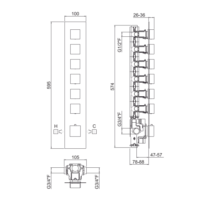 Carimali ILQUADRO  Внешняя часть вертикальная для термостатического смесителя с 6-ю независимыми выходами, цвет хром