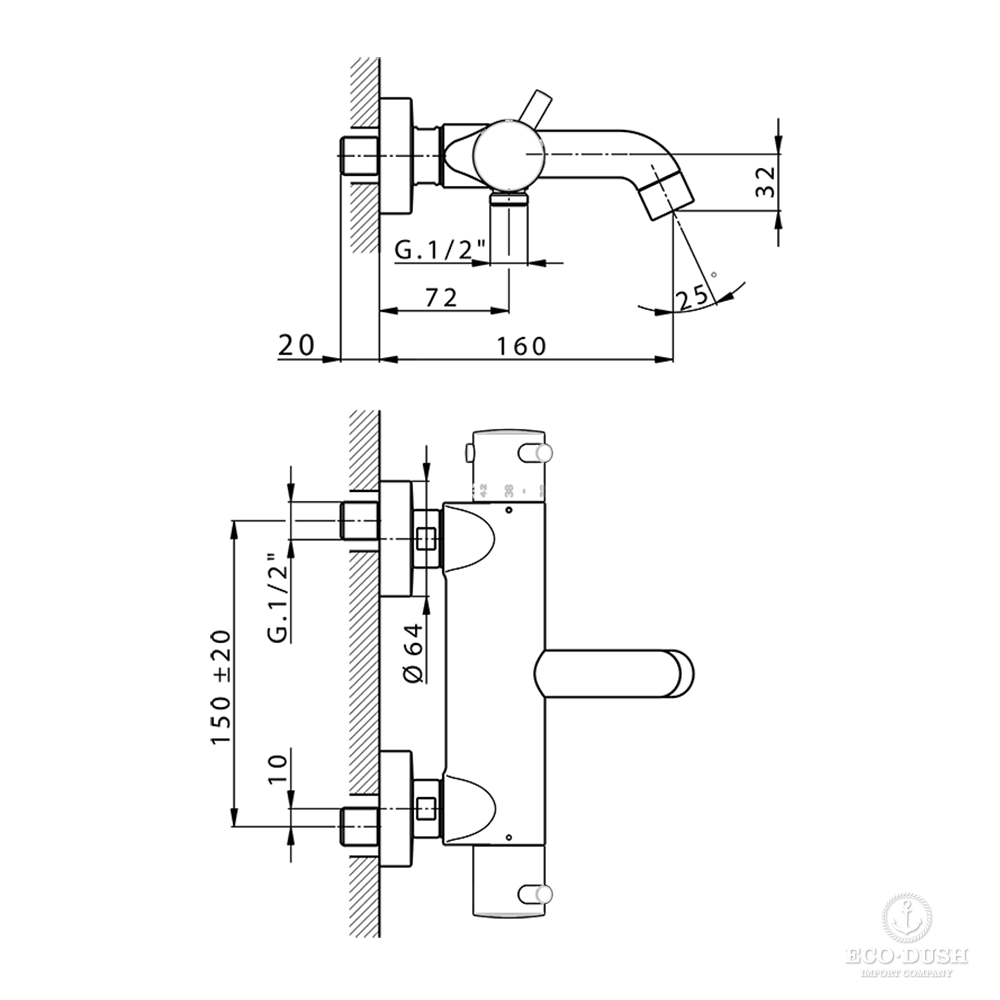 CISAL Less Minimal Смеситель термостатический настенный для ванны/душа с ручной лейкой,держателем и шлангом, цвет хром