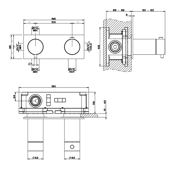 —Gessi Shower316 Термостатический смеситель, с подключением на 1/2", фильтрами и вентилем с керамическими дисками, на три позиции, цвет: шлифованная сталь