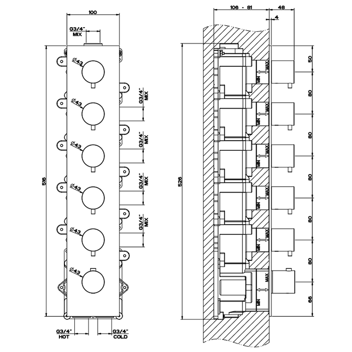 Gessi 316 Встраиваемый термостатический смеситель на 5 источников, резьба 3/4&quot, внешняя часть, цвет: brushed black metal pvd