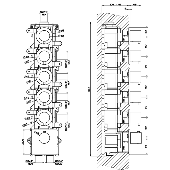 Gessi 316 Встраиваемый термостатический смеситель на 5 источников, резьба 3/4&quot, внешняя часть, цвет: brushed black metal pvd