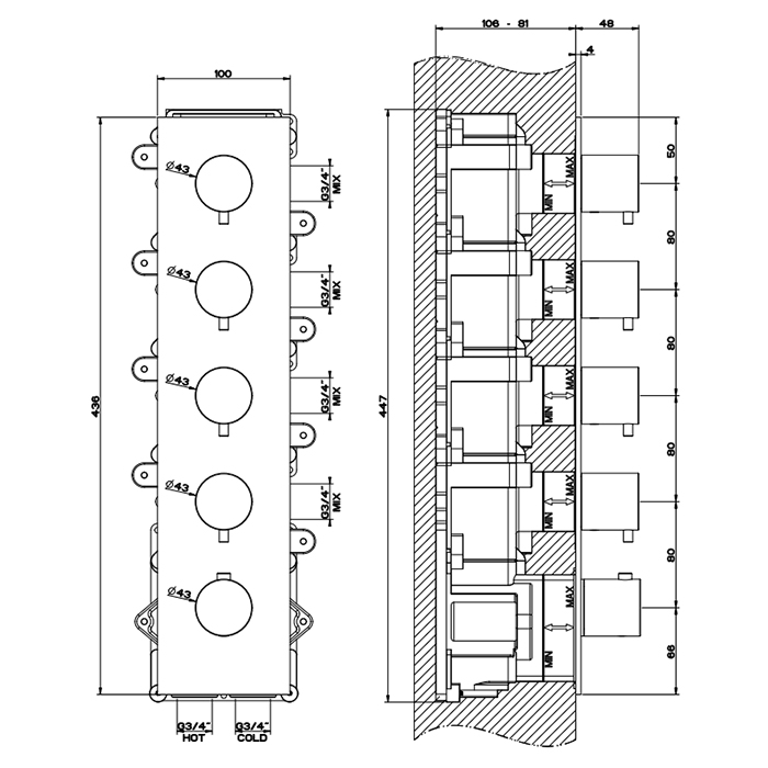 Gessi 316 Встраиваемый термостатический смеситель на 4 источника, резьба 3/4&quot, внешняя часть, цвет: steel brushed
