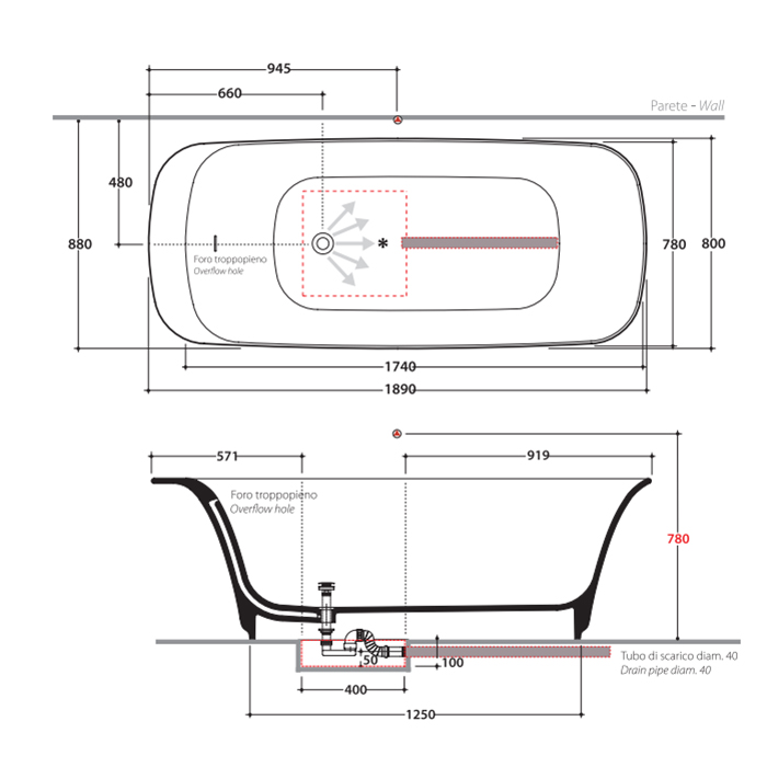 —Globo Relais Ванна отдельностоящая 189x88xh61см, с переливом, (без выпуска и сифона), материал: Pietraluce